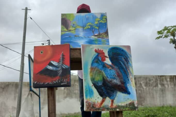 En Afrique, ce n’est pas facile. Tu peux être un bon peintre, mais ne pas être connu à l’international. Tu peux faire des dessins, avoir des fans, mais tes œuvres ne se vendent pas tous les jours. Même quand tu les vends, le gain ne peut pas être comparé à celui des grands peintres. Mais, puisque je suis également un artisan, je fais aussi des colliers, je décore des vases, je fais un peu de tout et je vends lorsque j’expose dans les rues. Les gens trouvent mes œuvres belles et c’est ce qui m’aide. Je ne gagne pas beaucoup d’argent avec les tableaux, mais je ne peux pas arrêter de peindre. Quand je ne peins pas, je me sens impuissant.